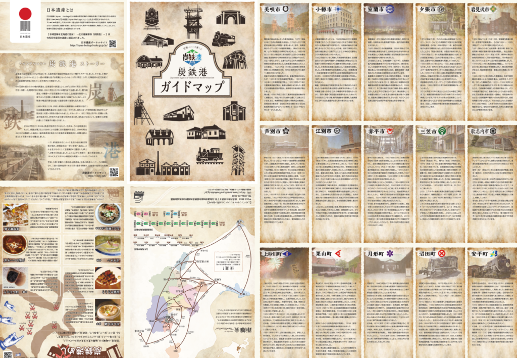 炭鉄港ガイドマップ 炭鉄港に関する施設等が一覧できるガイドマップです。 沼田町から室蘭市までの位置間がひと目で確認でき、炭鉄港グルメ・炭鉄港のストーリー・炭鉄港がある14市町の歴史も掲載されています。 ガイドマップをお求めの方は、炭鉄港ガイドマップに掲載されている14市町(夕張市・岩見沢市・美唄市・芦別市・赤平市・三笠市・上砂川町・栗山町・月形町・沼田町・小樽市・室蘭市・安平町・江別市)で配布しておりますので、お問い合わせ下さい。 【概要面】 【地図面】